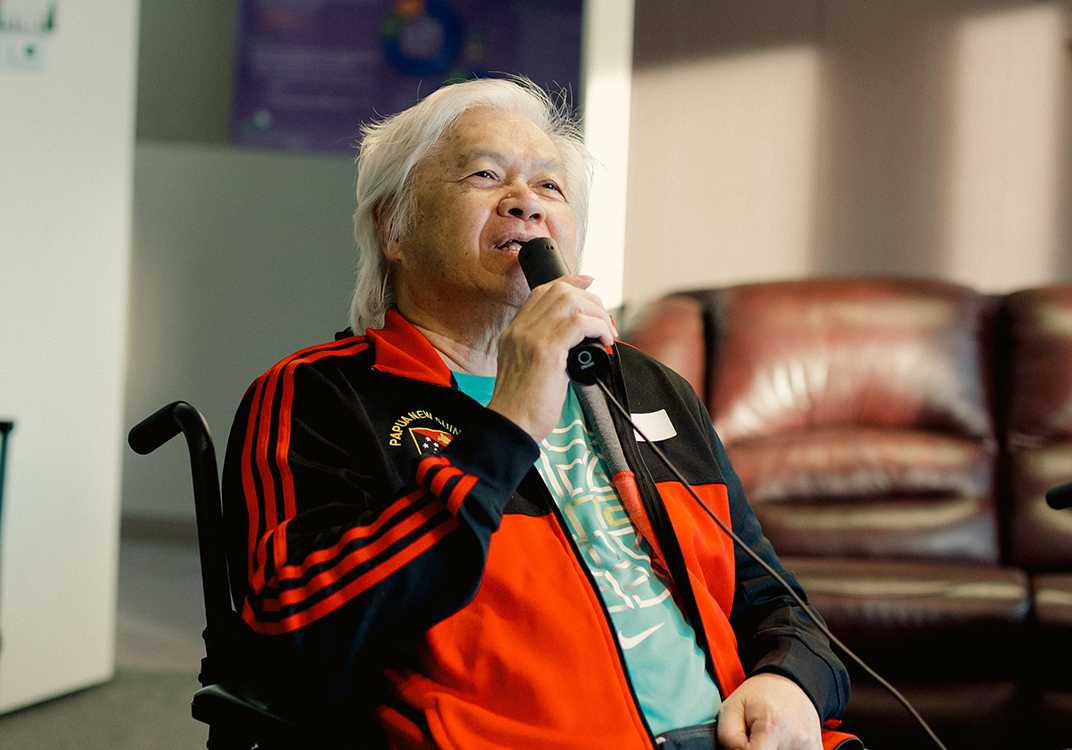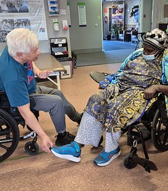 Andrew interacts with a participant and their support person, embodying his role as a volunteer.